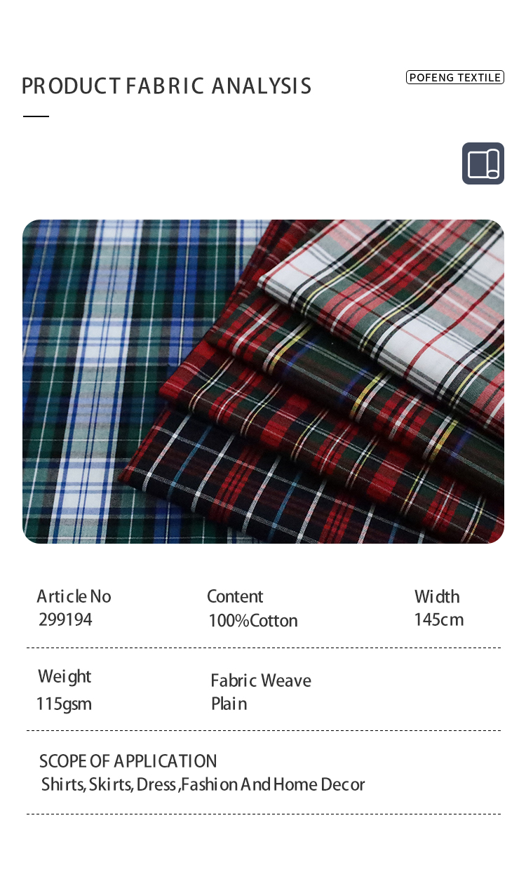Cotton Yarn-Dyed 115gsm Tartan Check Plaid Fabric for Boys Girls Children’s Clothing Men’s Women’s Shirts Dress Pants