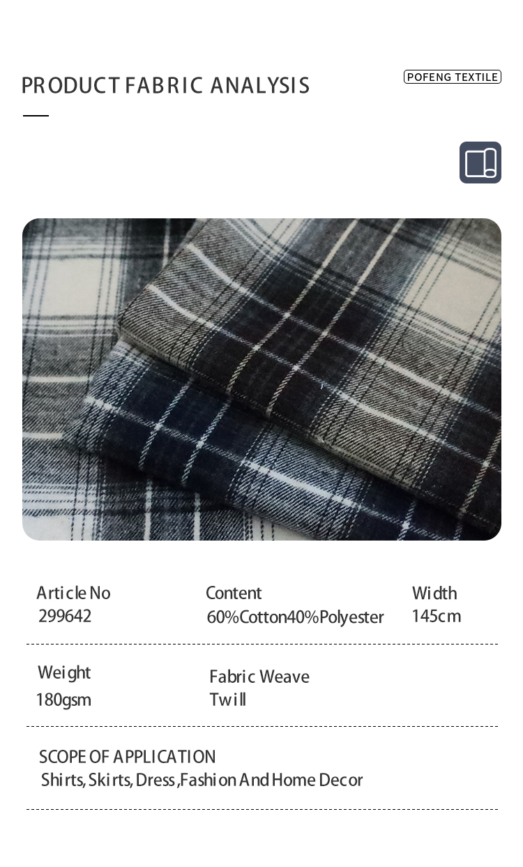 60% Cotton 40% Polyester Tartan Check Plaid Fabric 180gsm Yarn Dyed Woven Soft Shirt Dress Pants for Home Textile Lining